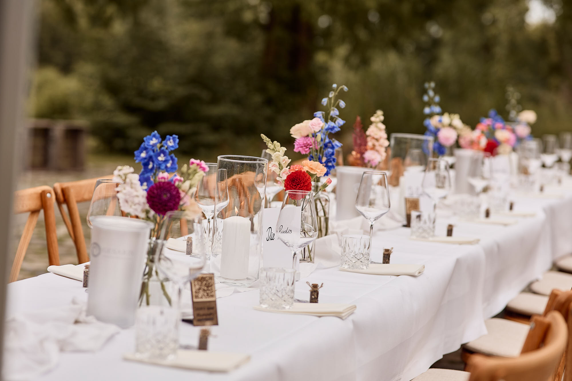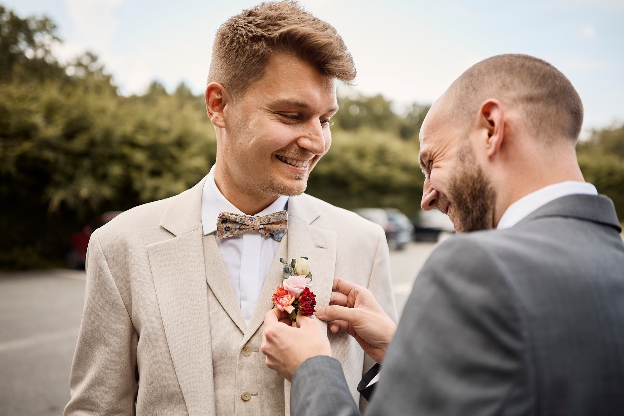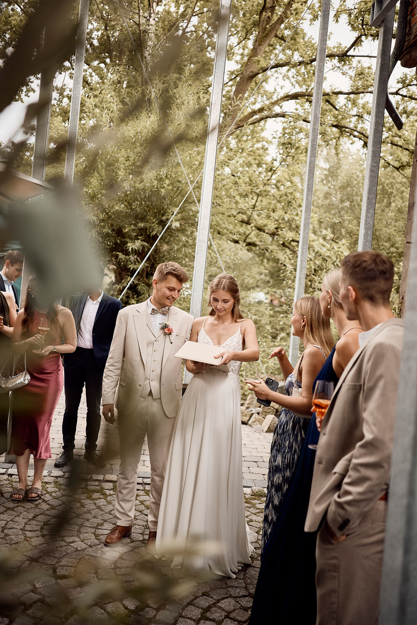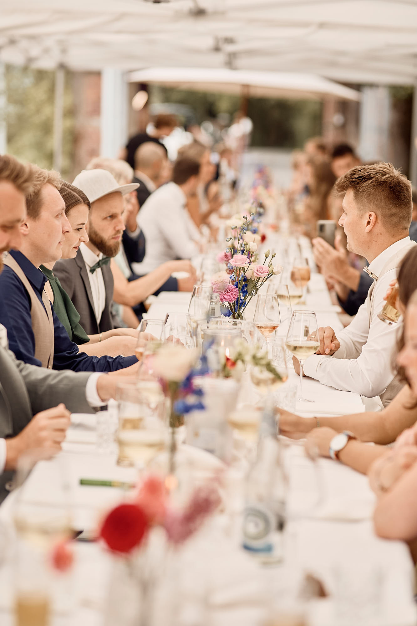 Dort haben wir uns etwa 15-20 Minuten Zeit für natürliche Brautpaarbilder genommen, ganz entspannt und ohne großen Aufwand. Anschließend entstanden noch die Gruppenfotos, bevor ich die Hochzeit bis zum Essen weiter dokumentiert habe. Eine rundum stimmige Hochzeit mit vielen echten Erinnerungen.