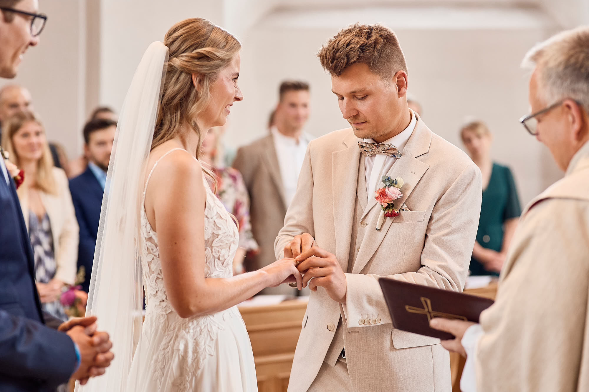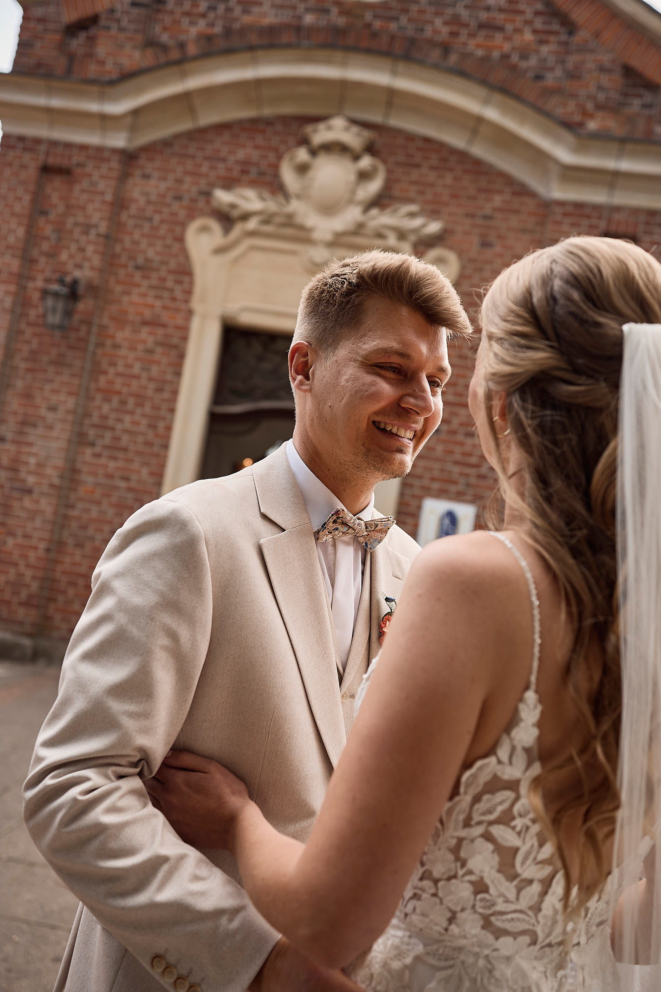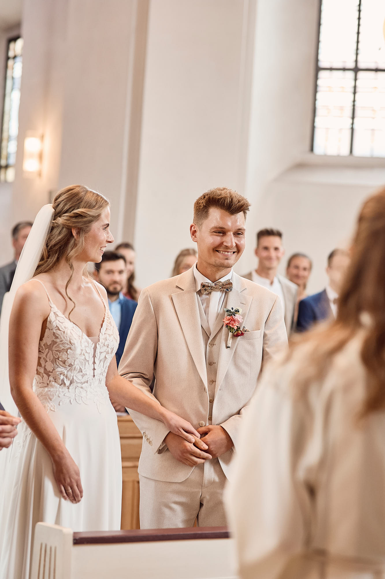 Die Dyckburgkirche in Münster ist für mich immer wieder ein besonderer Ort für kirchliche Trauungen. Ich fotografiere dort sehr gerne, weil sie hell, offen und unglaublich fotogen ist – und weil ich mich während der Trauung frei bewegen kann, ohne die Stimmung zu stören. Genau das ermöglicht mir, viele echte und ungestellte Momente einzufangen.